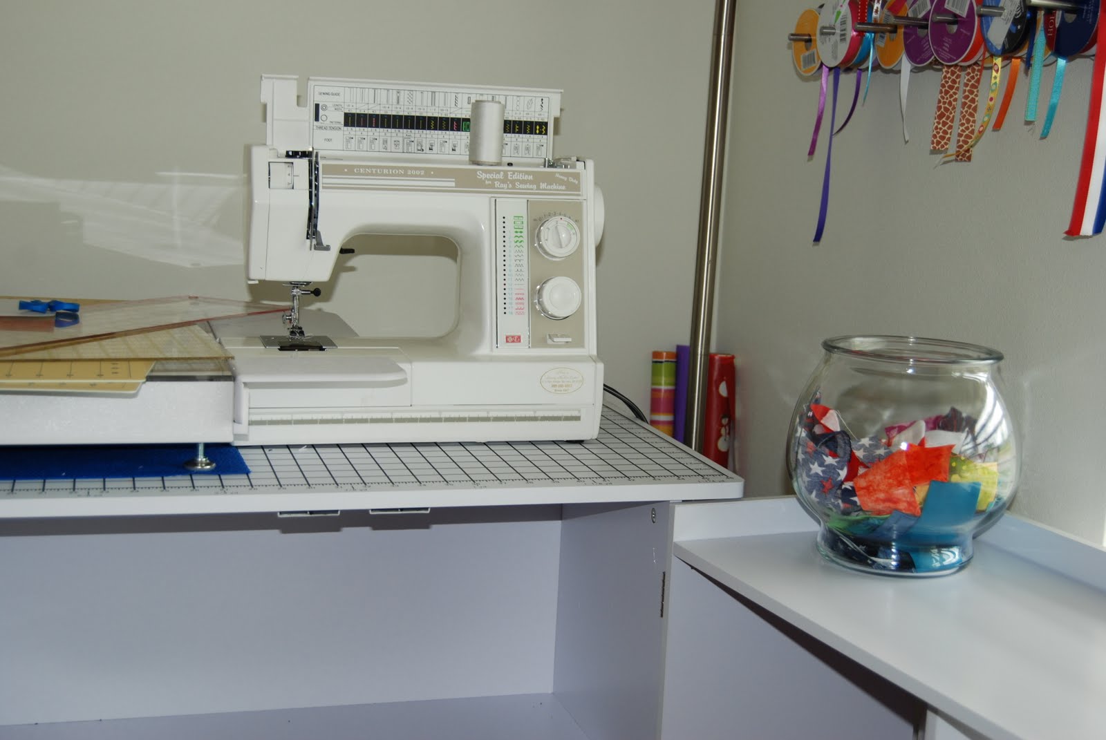 And it is conveniently located next to my sewing machine for easy access, so that I will be encouraged to save all my scraps from now on!