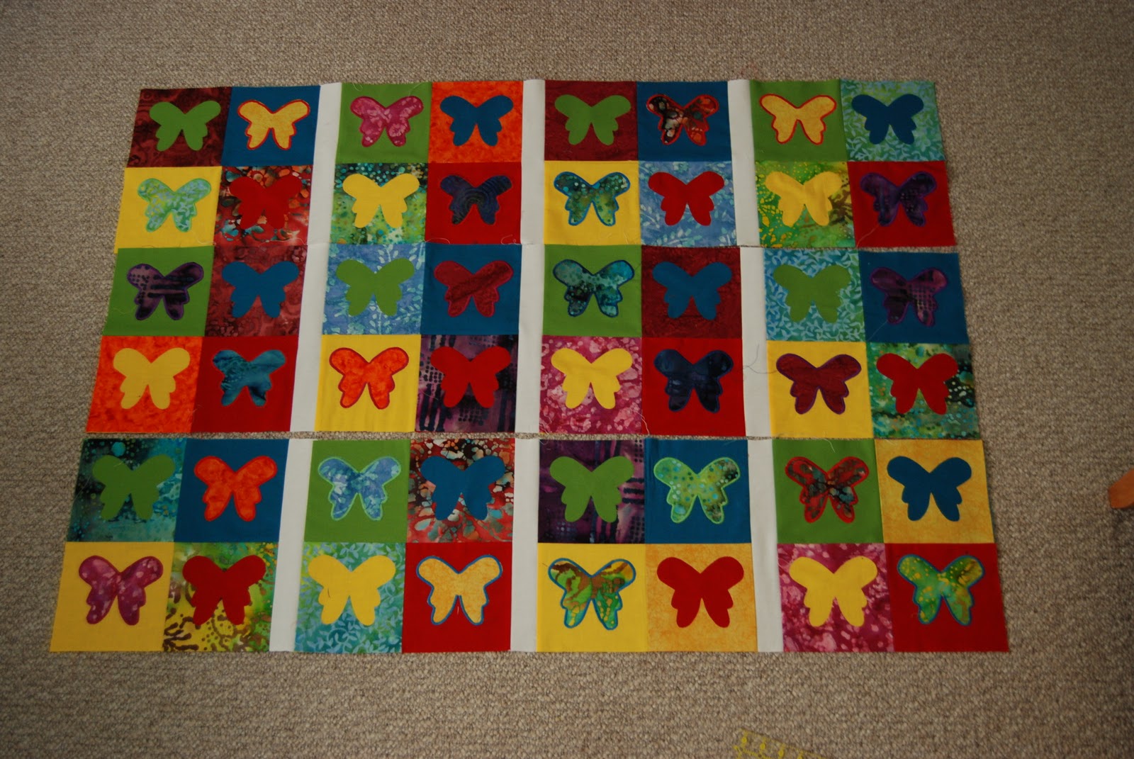 As always, I have about 10 projects in the queue. The two that are uppermost on my list are a St. Paddy’s day pillow stuffie – stay tuned for the pattern, and my butterfly quilt. I finally managed to get my back pieced and the batting cut, now I need to start safety pinning.